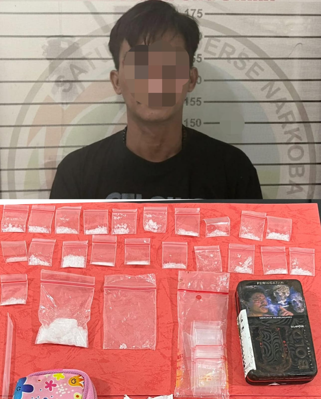 Dari hasil penggerebekan tersebut, petugas berhasil mengamankan barang bukti berupa 21 paket kecil sabu, 2 paket besar sabu, satu bundel plastik klip, satu buah centong dari pipet plastik, satu dompet warna pink bermotif, satu kotak kaleng warna hitam merek UBOLD, satu lembar tisu, serta satu unit handphone.